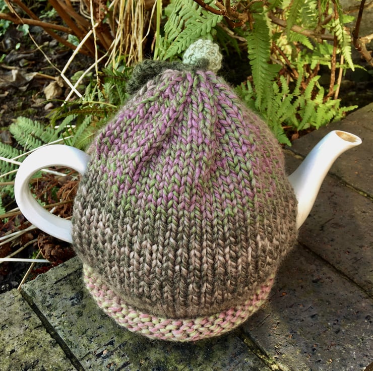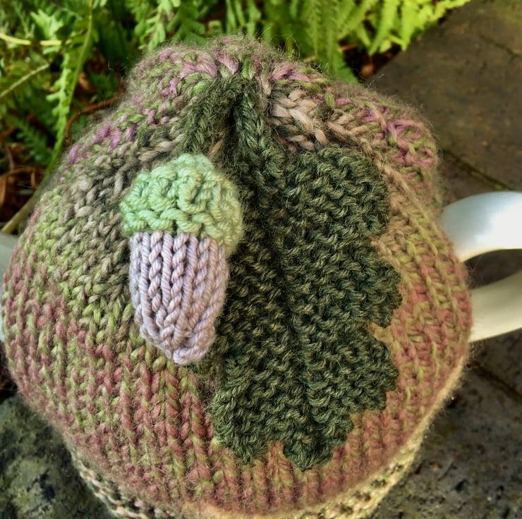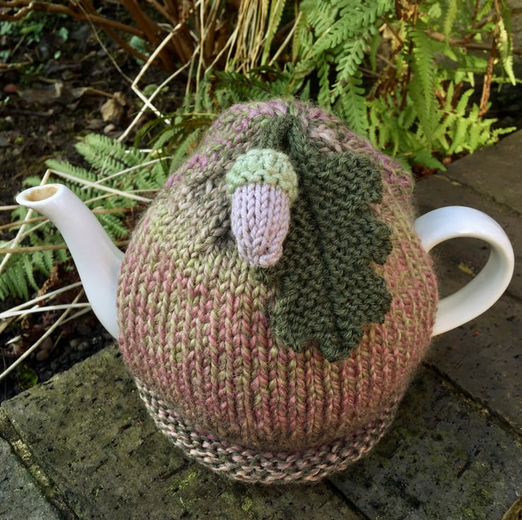 I have hand knitted this teapot cosy using a lovely wool mix yarn and attached a knitted oak leaf and acorn to the top. This soft chunky yarn has marbled shades of olive, pink, mauve and green. The oak leaf is knitted with a lovely olive green wool and the acorn is in complementary shades of pale green and mauve. I find that the tea cosy is thick enough to keep my teapot lovely and hot. It will fit a standard 4-6 cup teapot and is fairly stretchy, so will fit many different designs of teapot.