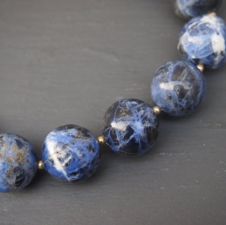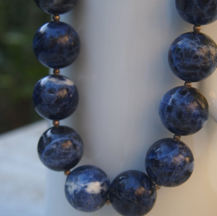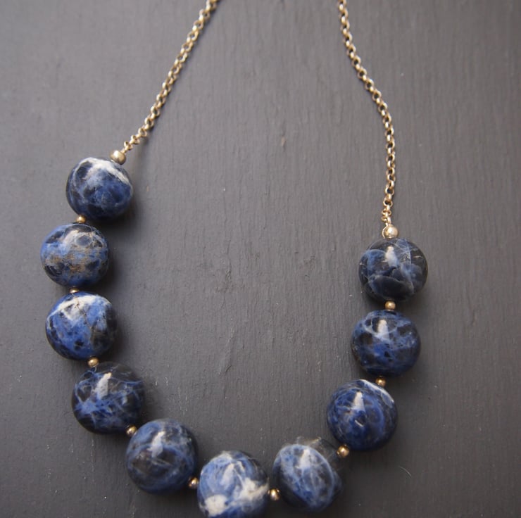 The necklace is 18 inches (46cm) long and sits just above the collar bone. The stones are like dark-blue marble, with splashes of black, white on shades of navy and light blue.