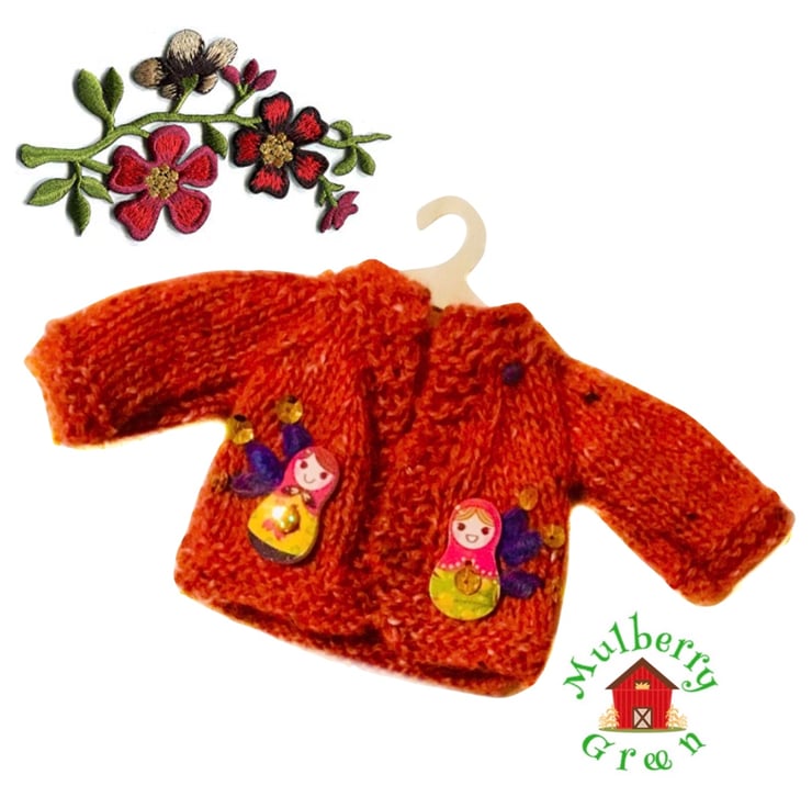 A lovely little orange cardigan, hand knitted in Rowan Felted tweed to fit the Mulberry Green dolls. The cardigan is is embroidered and decorated with two little Russian doll buttons. It comes on a cute little wooden hanger.