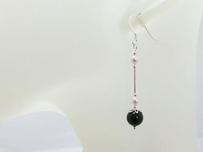 At the bottom of each earring is an 8mm black Swarovski Pearl with 2 x 4mm white ones above. The white Swarovski Pearls are separated with Sterling Silver tubes, small seamless beads & pretty bead caps.
