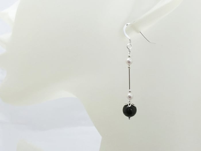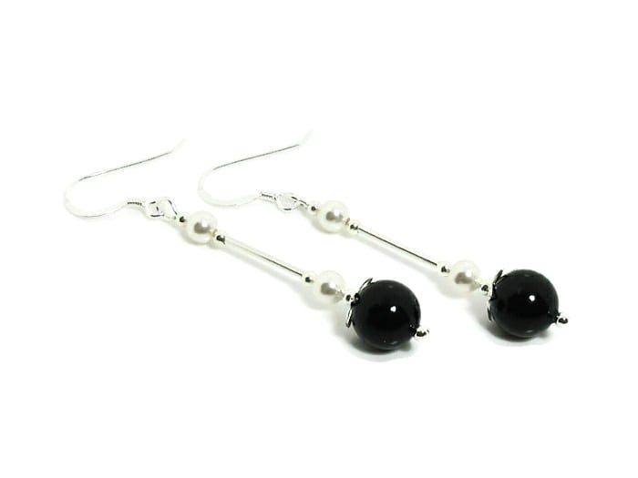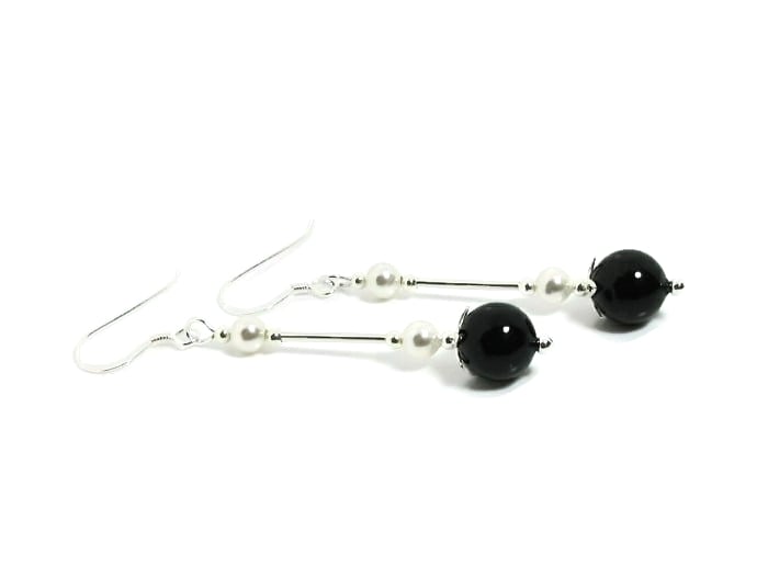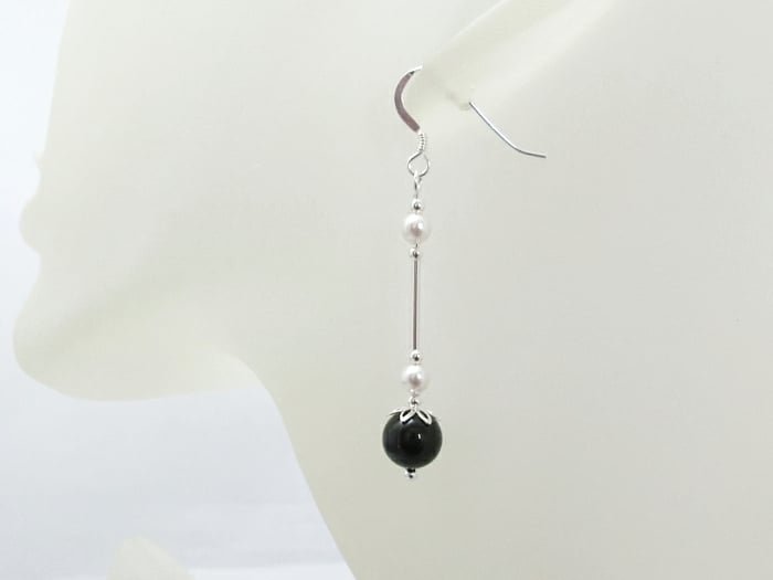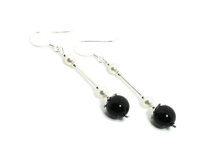 At the bottom of each earring is an 8mm black Swarovski Pearl with 2 x 4mm white ones above. The white Swarovski Pearls are separated with Sterling Silver tubes, small seamless beads & pretty bead caps.