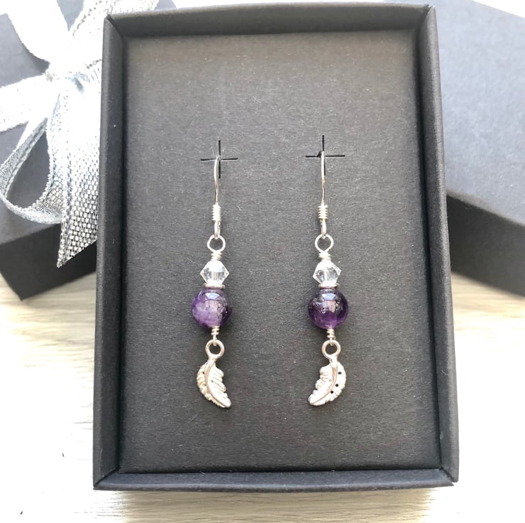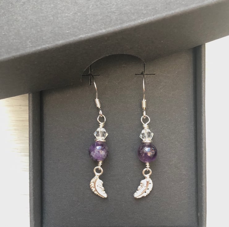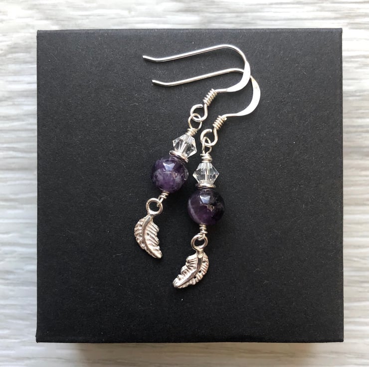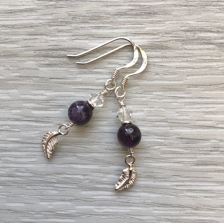 6mm semi precious Amethyst beads have been hand wired with a Swarovski crystal and a sterling silver leaf charm using sterling silver wire. These hang from sterling silver fish hook wires.