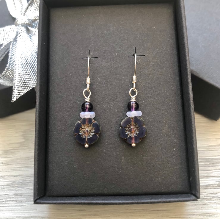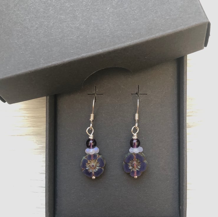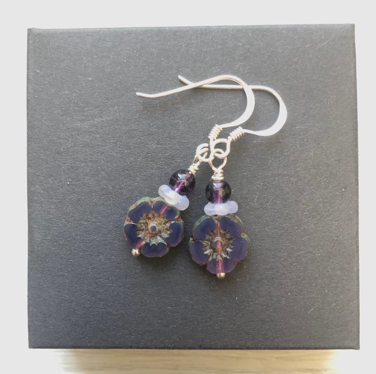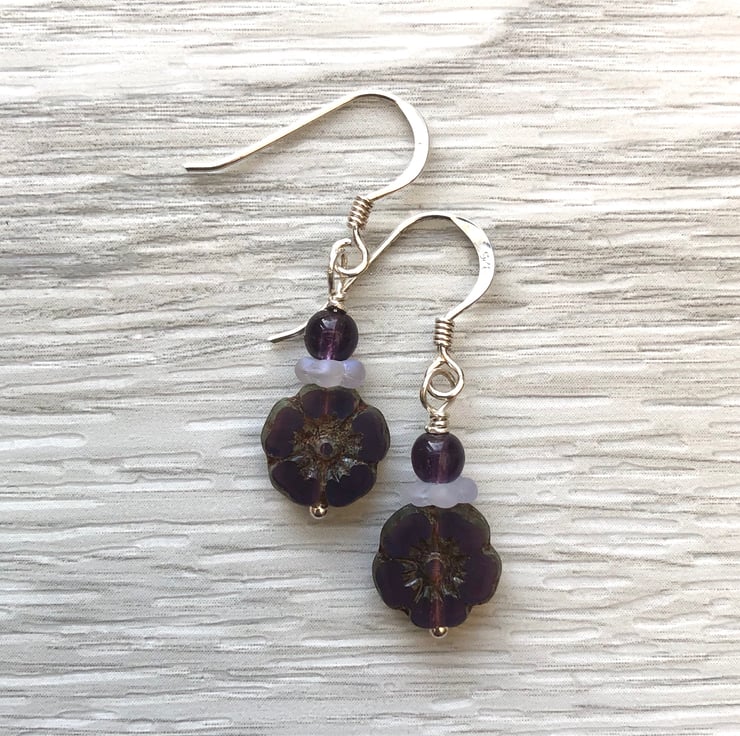 Super cute purple Czech glass flower beads have been hand wired with other Czech glass beads using sterling silver wire. These hang from sterling silver fish hook wires.