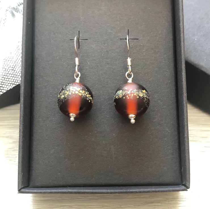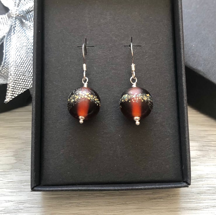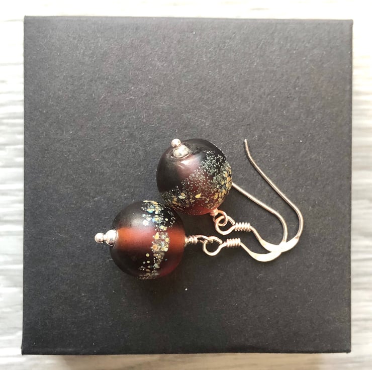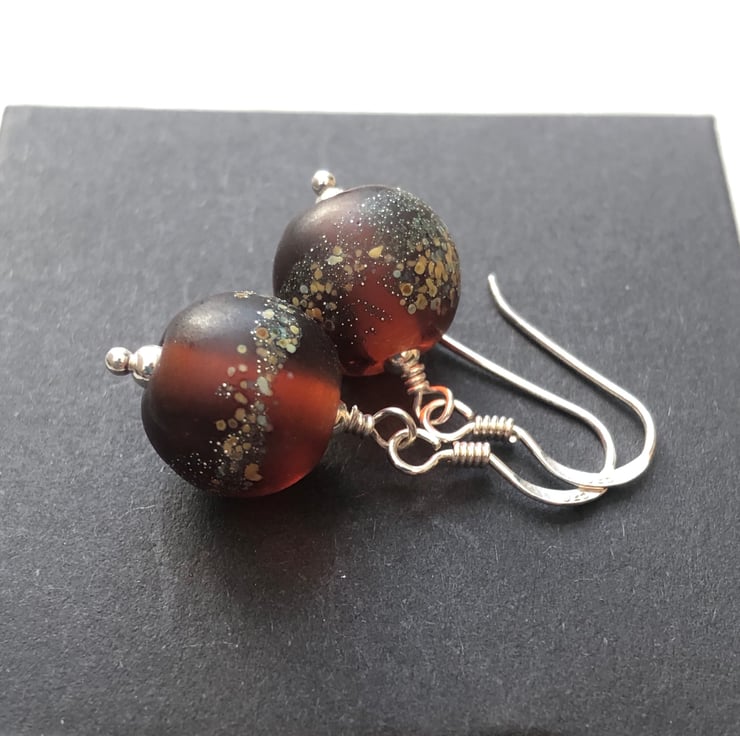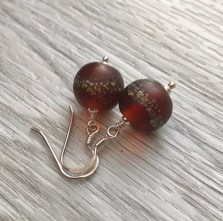 These unique autumnal earrings have been made using these stunning brown lampwork glass beads with raised silver detail. These have been hand wired with sterling silver beads using a sterling silver headpin and hang from sterling silver fish hook wires.