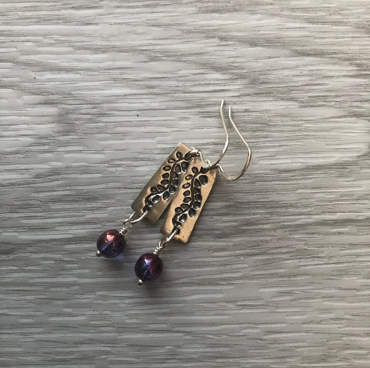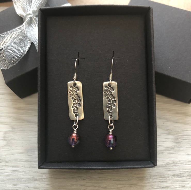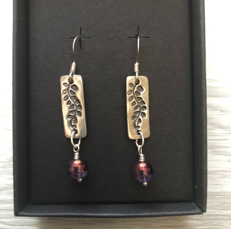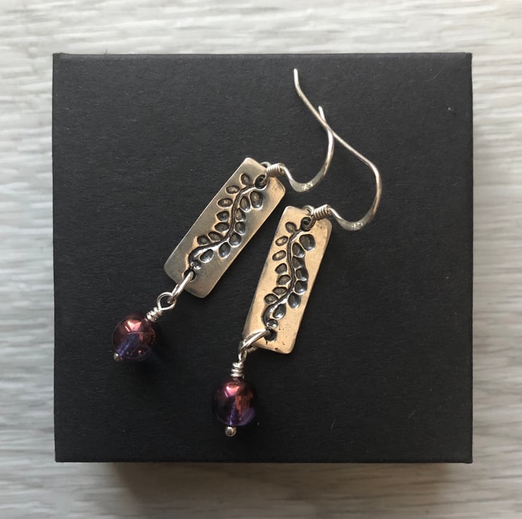 Cute 4mm luster purple Czech glass beads have been hand wired using a sterling silver headpin and hang beneath these stunning handmade sterling silver grape vine charms.