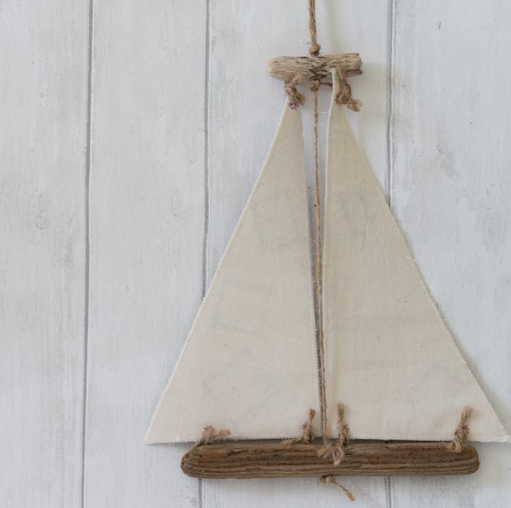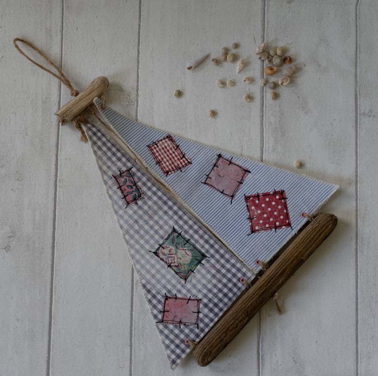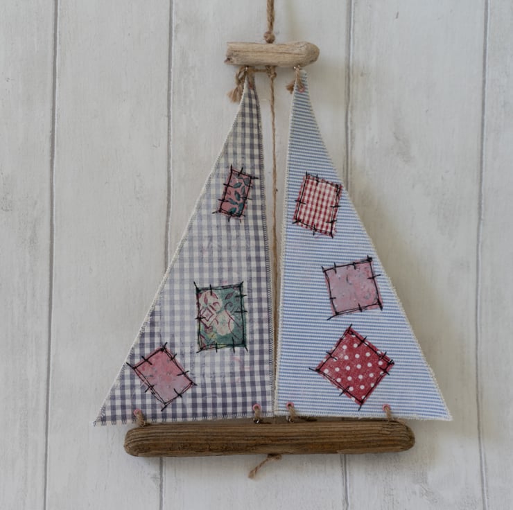 Made from Scottish driftwood and repurposed fabric, this unique little boat would look lovely hanging in any coastal setting. Using free motion machine embroidery, (“drawing” with the sewing machine), the sails have been embroidered with applied painted patches of fabric, giving it a sea worn coastal look.