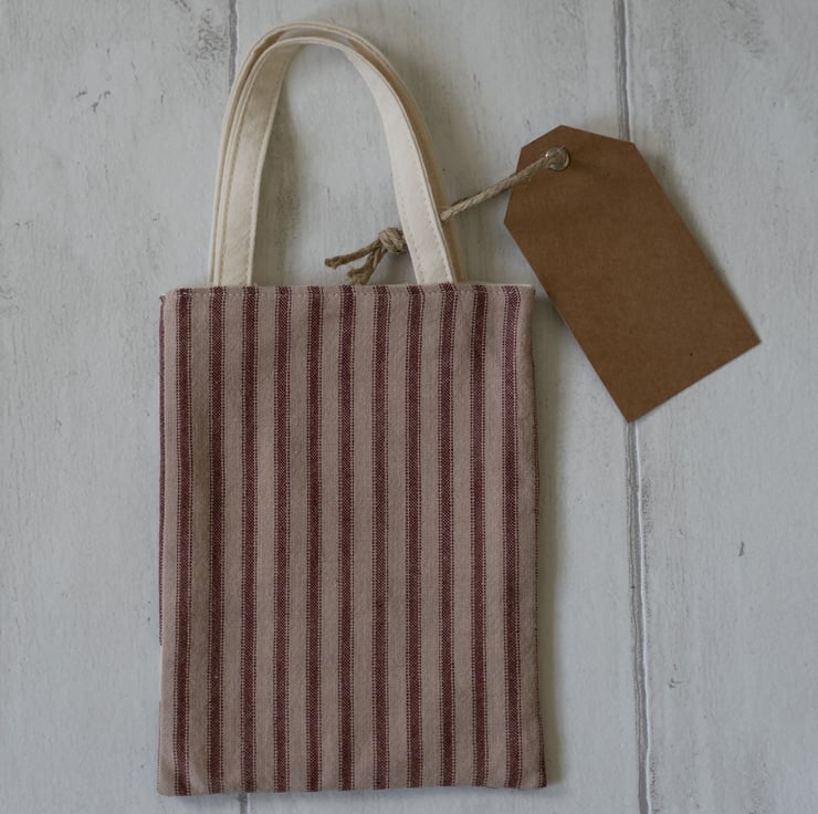 The deep red ticking style cotton fabric that this is made of, gives the bag a vintage feel. It would be great to use to present a Valentine's Gift.