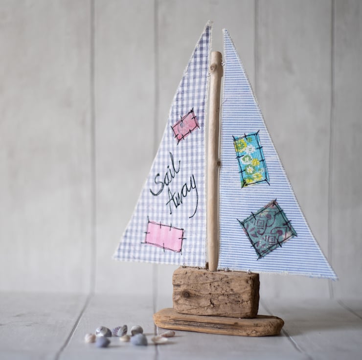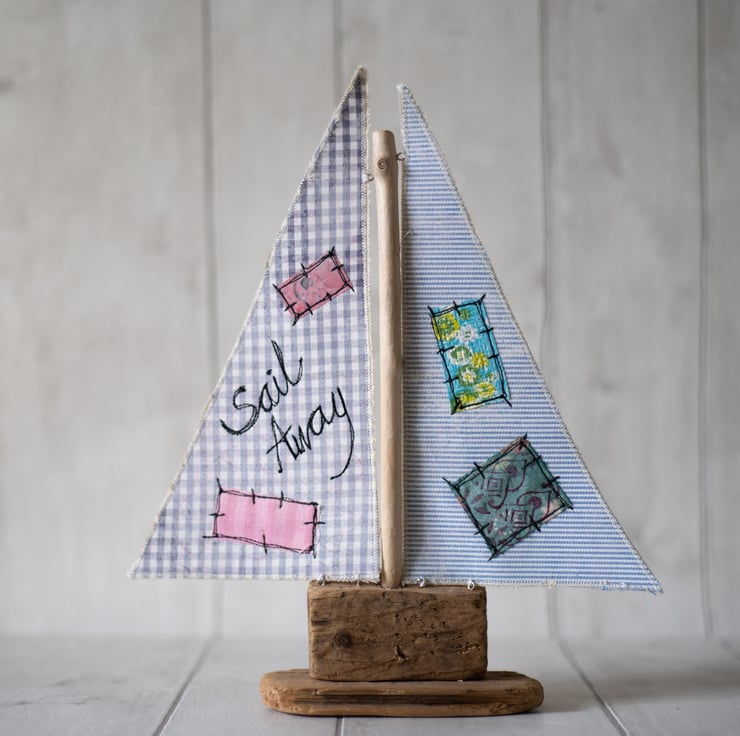 Made from Scottish driftwood and repurposed fabric, this unique little boat would look lovely in any coastal setting. Using free motion machine embroidery, (“drawing” with the sewing machine), the sails have been embroidered with applied painted patches of fabric, giving it a sea worn coastal look. It also has the words "Sail Away" embroidered on it, again, using free-motion techniques. Little metal rings attach the fabric to the driftwood and add interesting detail.