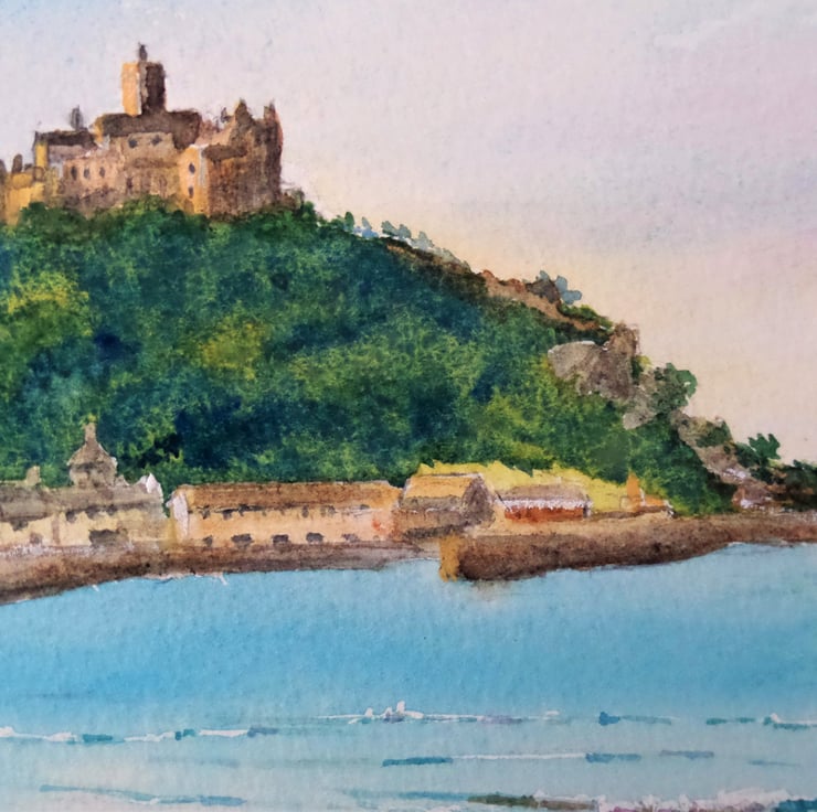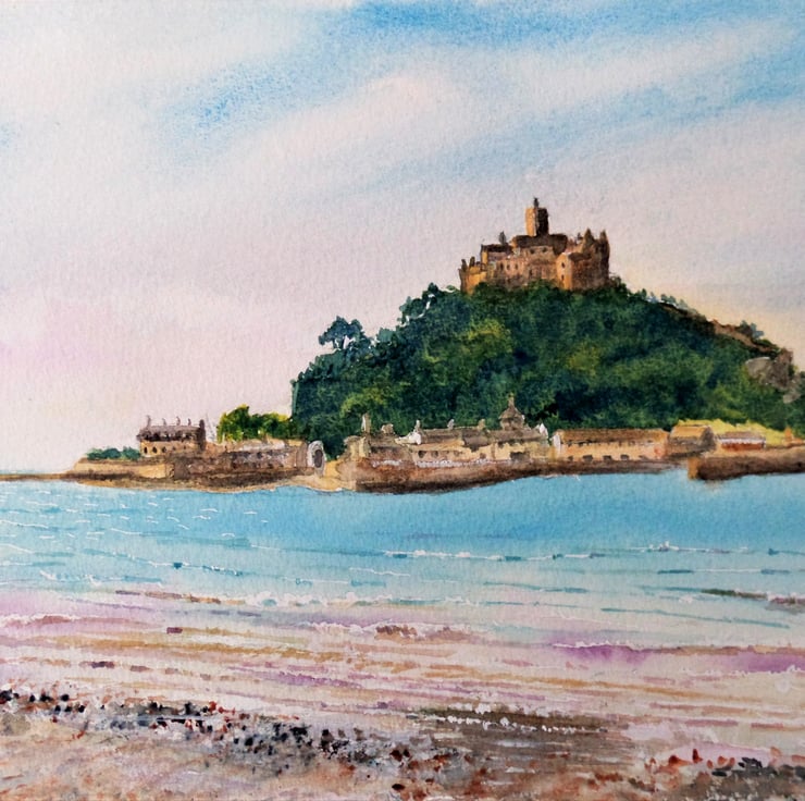 My original watercolour painting of the famous St. Michael's Mount, off the coast of Marazion in west Cornwall. Based on my own photograph, this is a view taken towards the west side of the island.