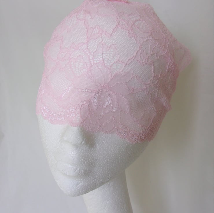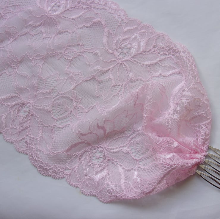 This is a stunning bandeau birdcage style pale pink veil made from a rare pretty soft lace.