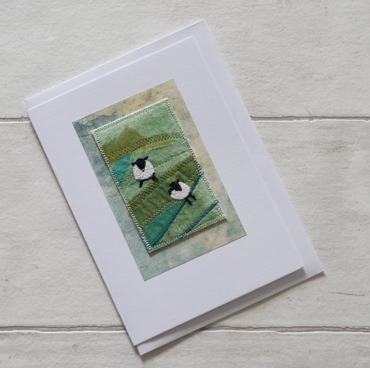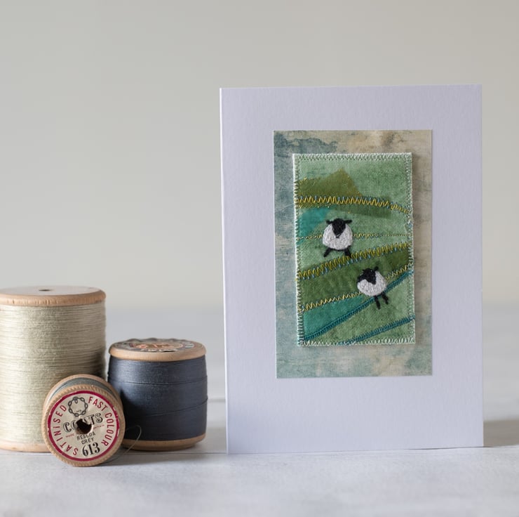 Featuring two happy gamboling sheep, this mixed media textile card is made using techniques including free motion machine embroidery and painting.