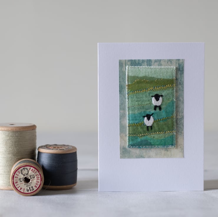 Featuring two happy gamboling sheep, this mixed media textile card is made using techniques including free motion machine embroidery and painting.