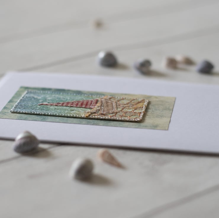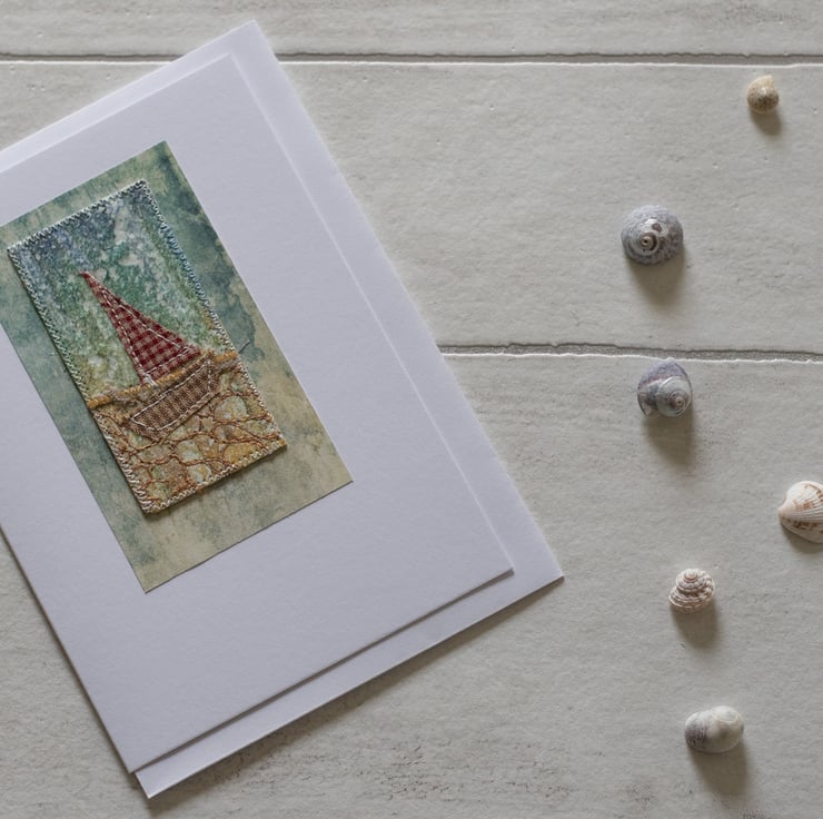 Featuring a little red sailed boat, this mixed media textile card is made using techniques including free motion machine embroidery, painting with dyes and applique.
