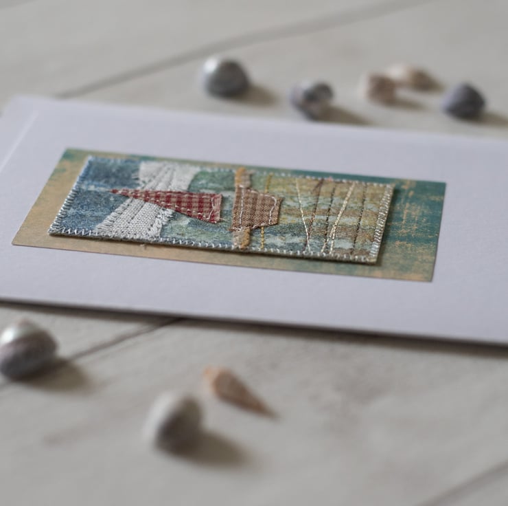 Featuring a little red sailed boat, this mixed media textile card is made using techniques including free motion machine embroidery, painting with dyes and applique.