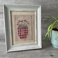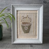 Incorporating real pressed hydrangea flowers, this mixed media textile card is made using free motion machine embroidery (drawing with a sewing machine needle) with silver metallic thread. It is edged with the same silver thread and has added decorative threads to create a little border down the sides.