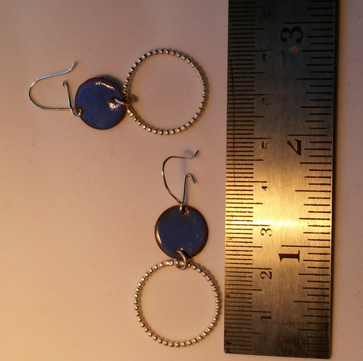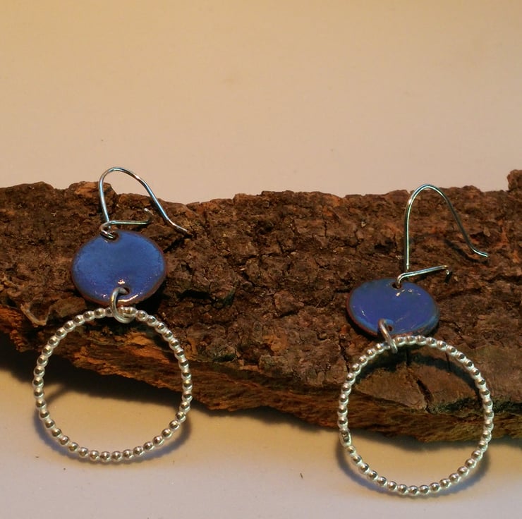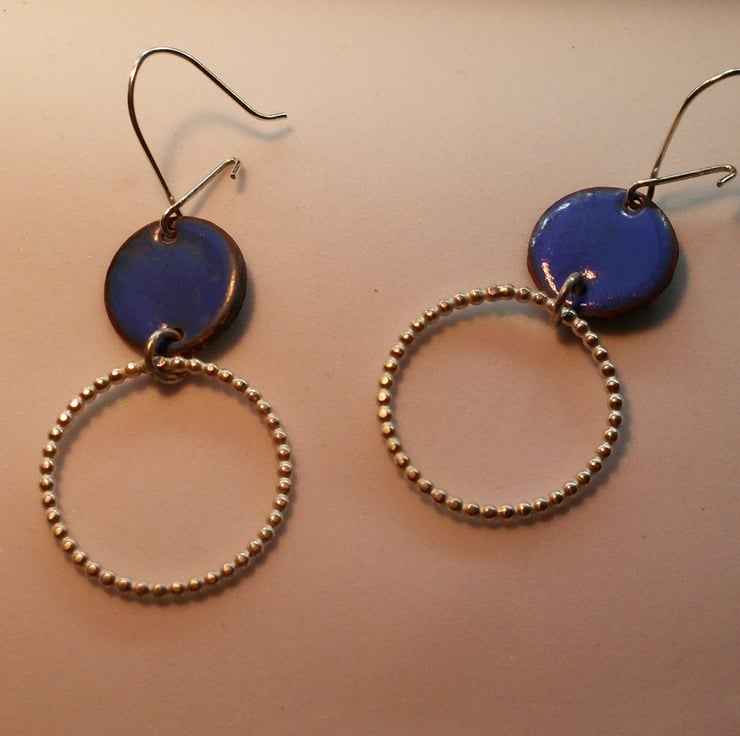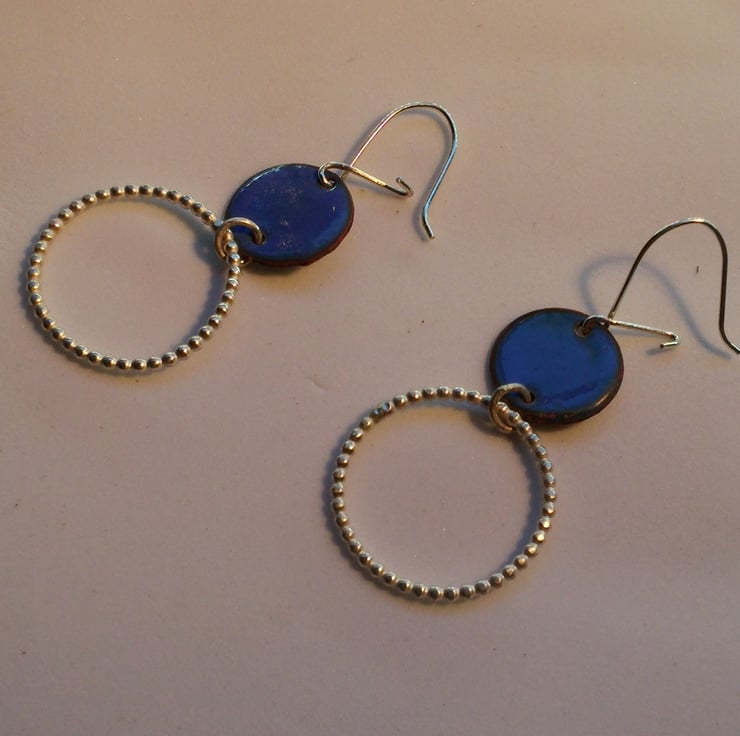 These earrings have solid silver ear wires and beaded wire hoops dandling from blue enamelled copper circles.