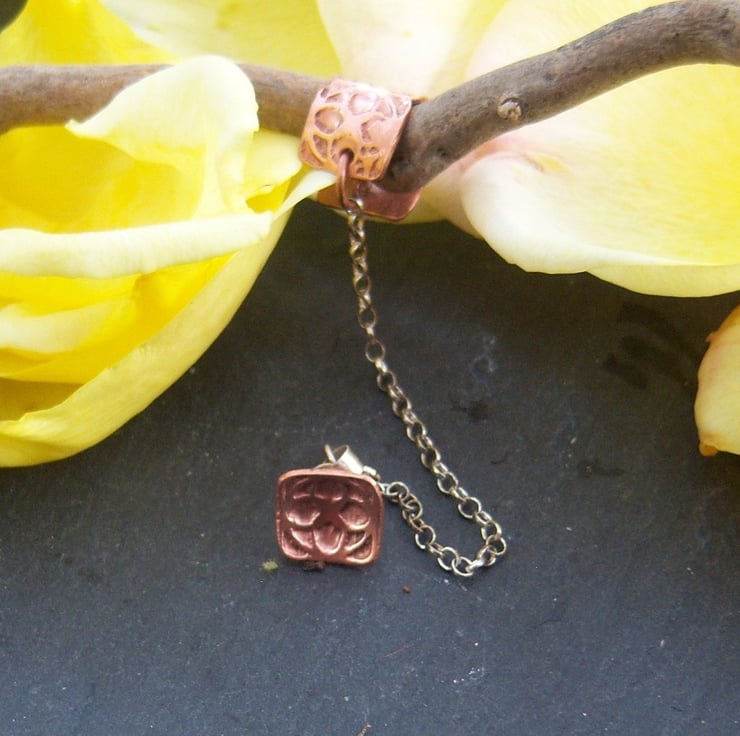 Ear cuff 10mm wide and 10mm in diameter, made from copper and etched with a Celtic design. This is attached to a 10mm matching square copper stud with 8cms of sterling silver belcher chain. The stud has a sterling silver scroll/butterfly attached to the sterling silver post.