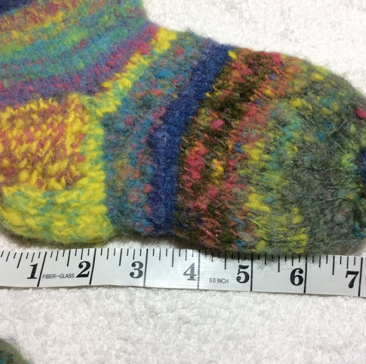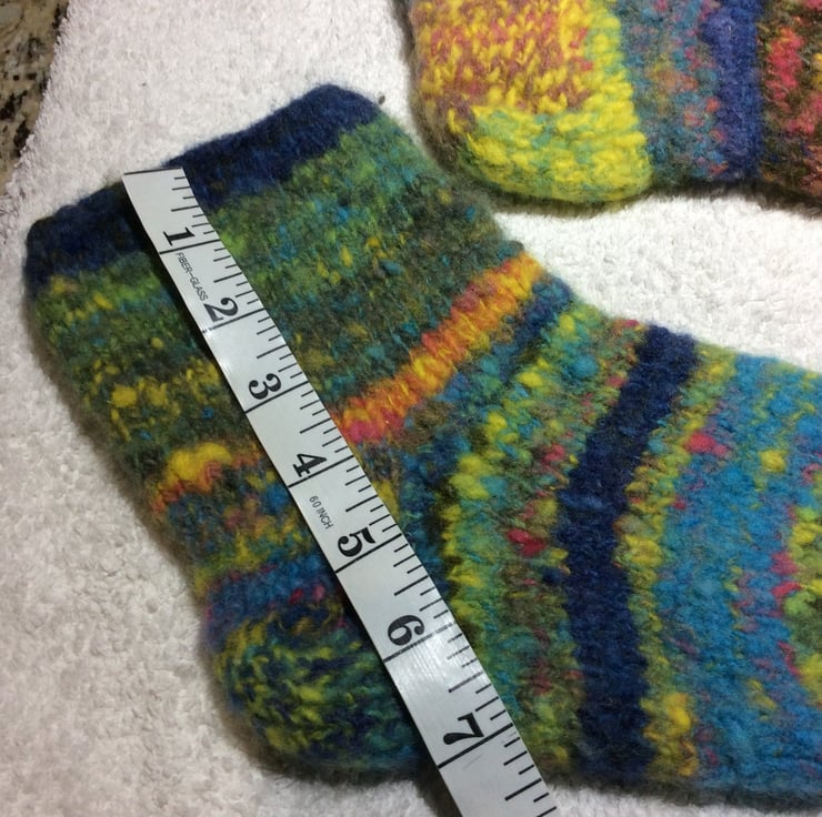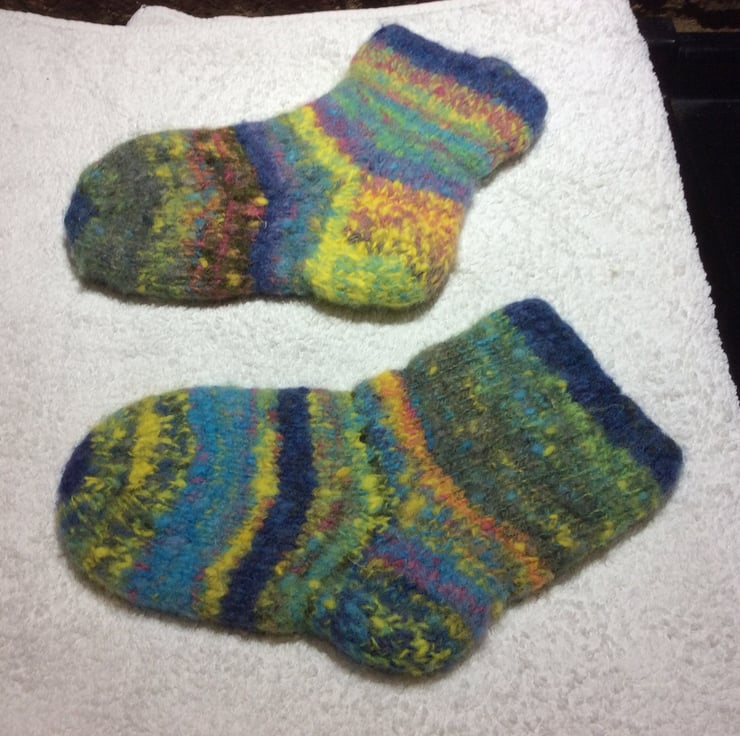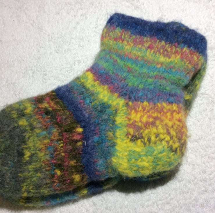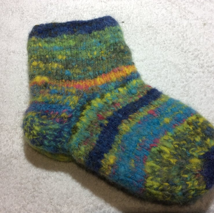 Handspun hand knitted felted cosy socks from the fleece of sheep who graze near the banks of the river Trent in Nottinghamshire. Some handpicked autumn blackberries were used to make one of the dyes applied to the fleece before carding and blending. Random colours give these fun socks their own personality. They measure 8 ins20cm from heel to toe.