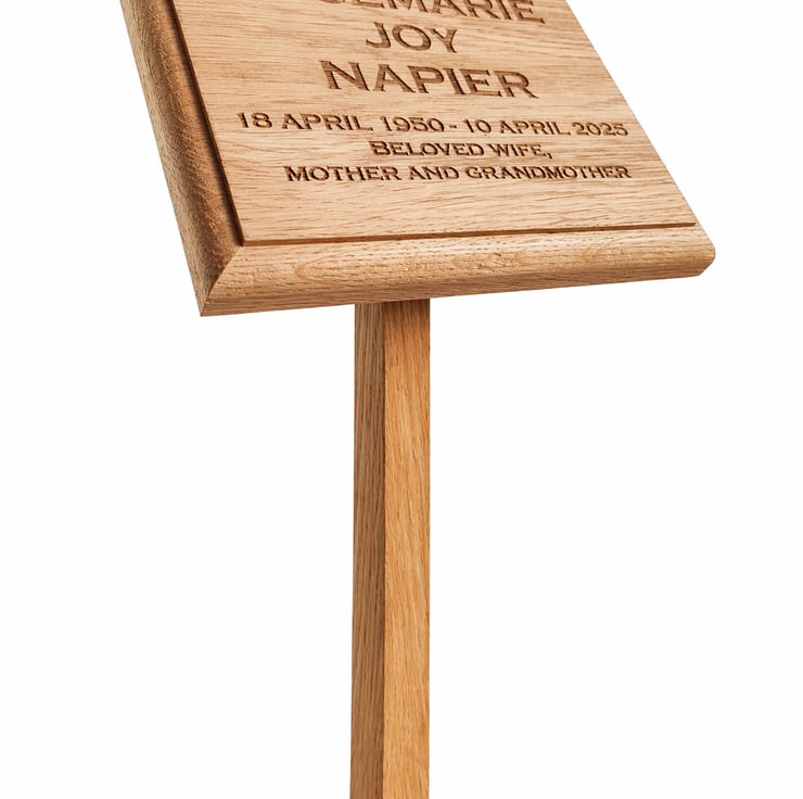 Beautiful Natural Solid Oak Hardwood Memorial Marker with all bevelled edges and attached stake.