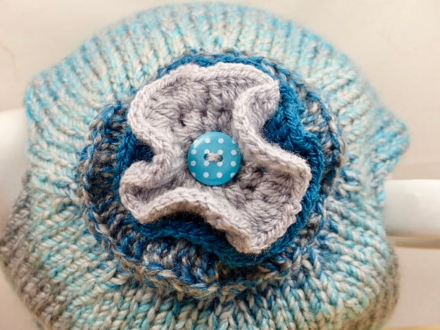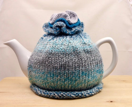 A hand knitted tea cosy in a chunky self patterning yarn in a turquoise/grey colour which is 100% acrylic and is decorated with a three layer flower on the top with a spotty button. The larger layer of the flower is in the same yarn as the cosy, the middle layer is in teal and the smallest layer is a light grey. The cosy has been knitted to fit a standard 5 cup teapot and has plenty of stretch. It has slits for the hand and spout so just slip it over your pot to keep your tea warm.