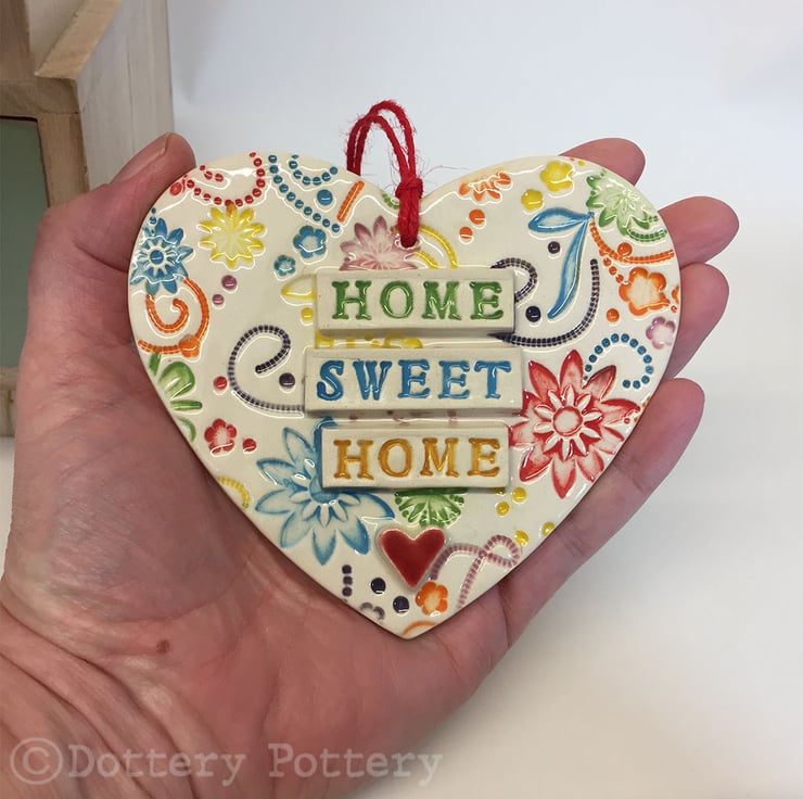 This ceramic heart is made from white earthenware clay and decorated with the words, Home Sweet Home. It has a swirly patterned, bright background. 10 centimetres and the same in height. 5mm thick