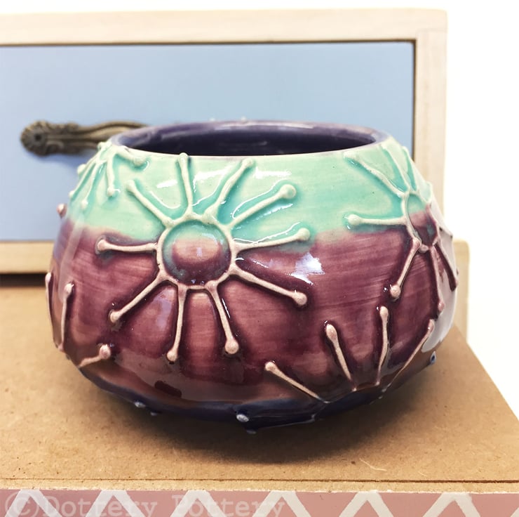This hand thrown pottery bowl is made from earthenware clay.It has been thrown on the pottery wheel and decorated with a raised pattern. It has been finished in a range of purple, plum and blue glazes. 5.5cm high x 9cm wide. .