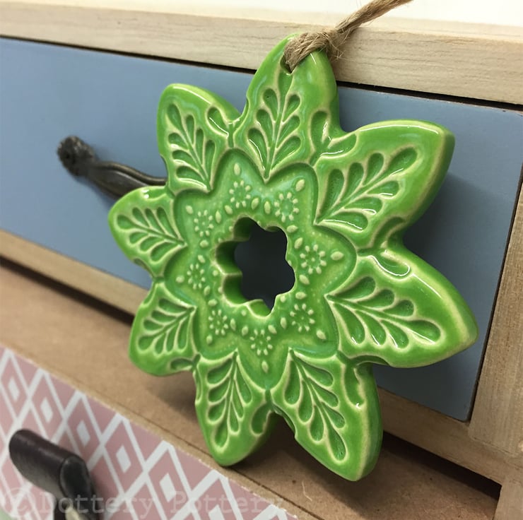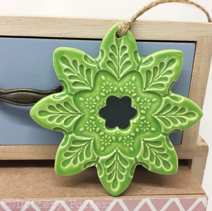 This listing is for a ceramic flower decoration. It is made from white earthenware clay, imprinted with pattern and finished with a bright, glossy glaze. It has been fired twice, once to the bisque stage and then a second firing for the glaze. It measures 8.5 centimetres wide and the same in height x 5mm thick. It can be hung outside.