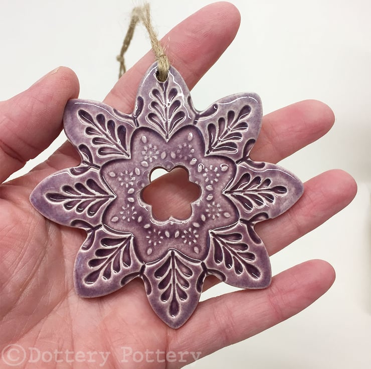 This listing is for a ceramic flower decoration. It is made from white earthenware clay, imprinted with pattern and finished with a bright, glossy glaze. It has been fired twice, once to the bisque stage and then a second firing for the glaze. It measures 8.5 centimetres wide and the same in height x 5mm thick. It can be hung outside.