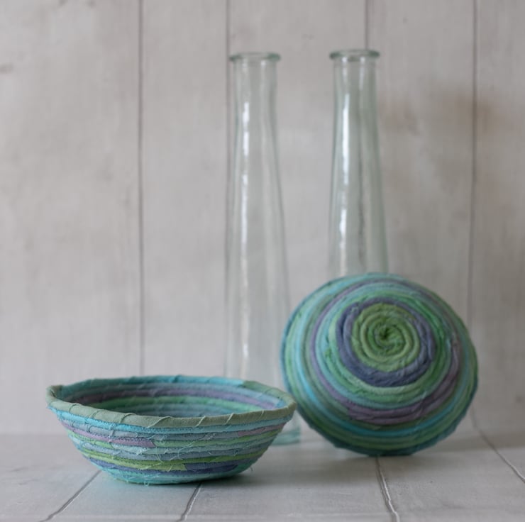 It is made from raw edged cotton, hand dyed in beautiful painterly hues of blue, green and mauve, by me. The fabric is wrapped round thin cable and stitched by machine. As the fabric has raw edges, there is a degree of natural fraying.