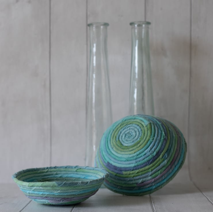 It is made from raw edged cotton, hand dyed in beautiful painterly hues of blue, green and mauve, by me. The fabric is wrapped round thin cable and stitched by machine. As the fabric has raw edges, there is a degree of natural fraying.