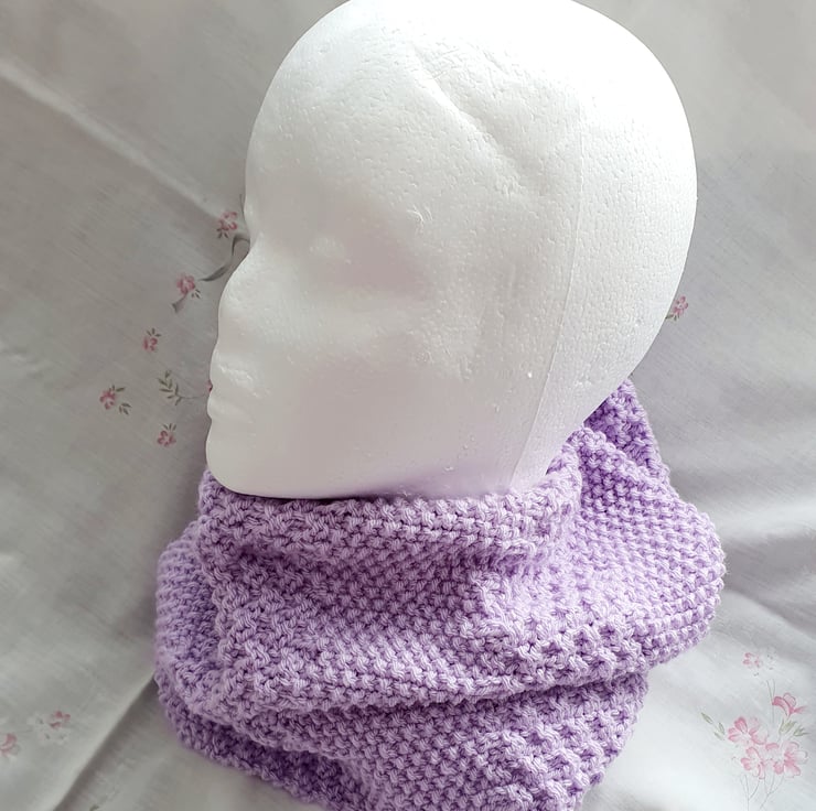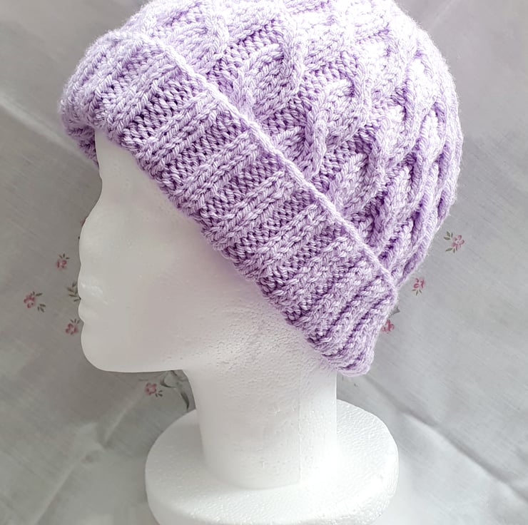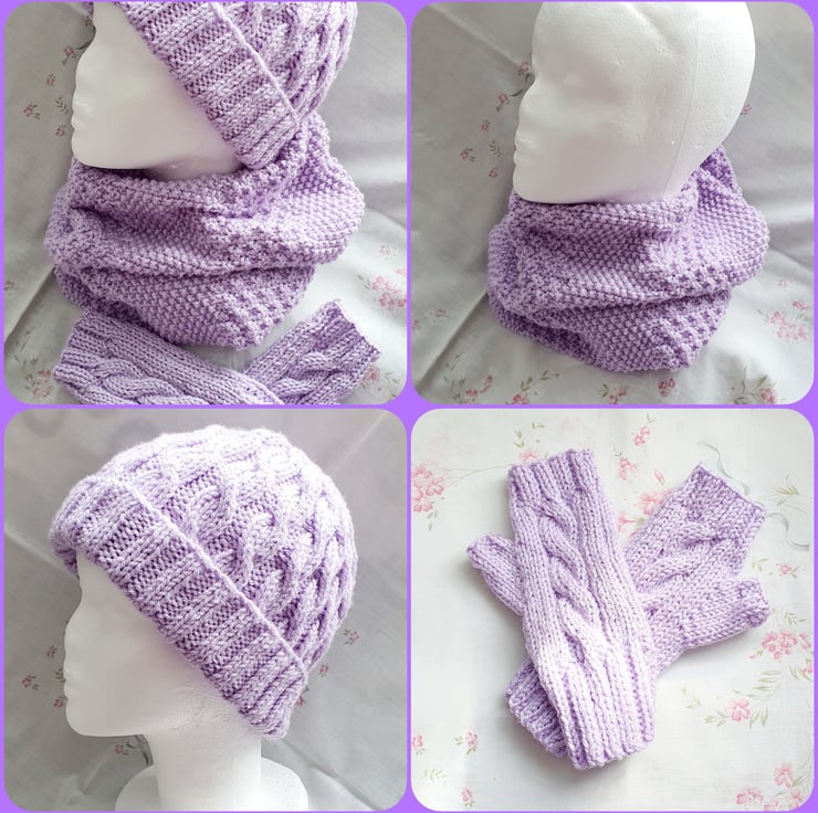 Lilac Hand-knitted Aran cable hat, cowl and matching fingerless mitts.