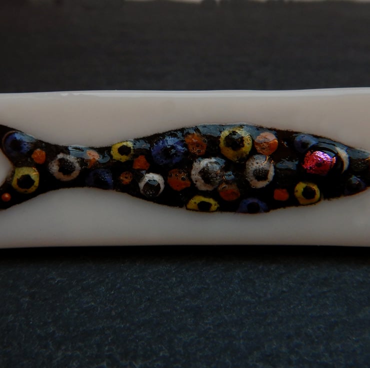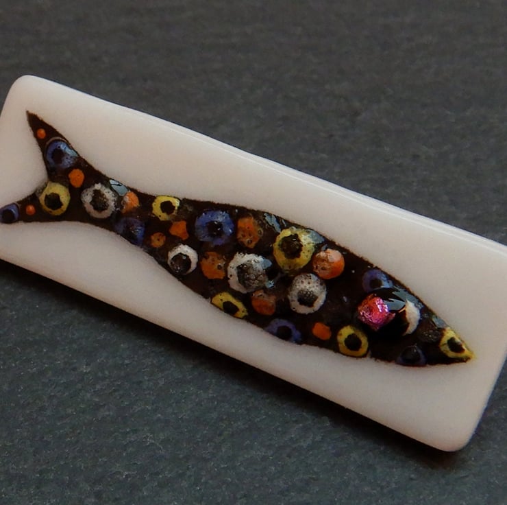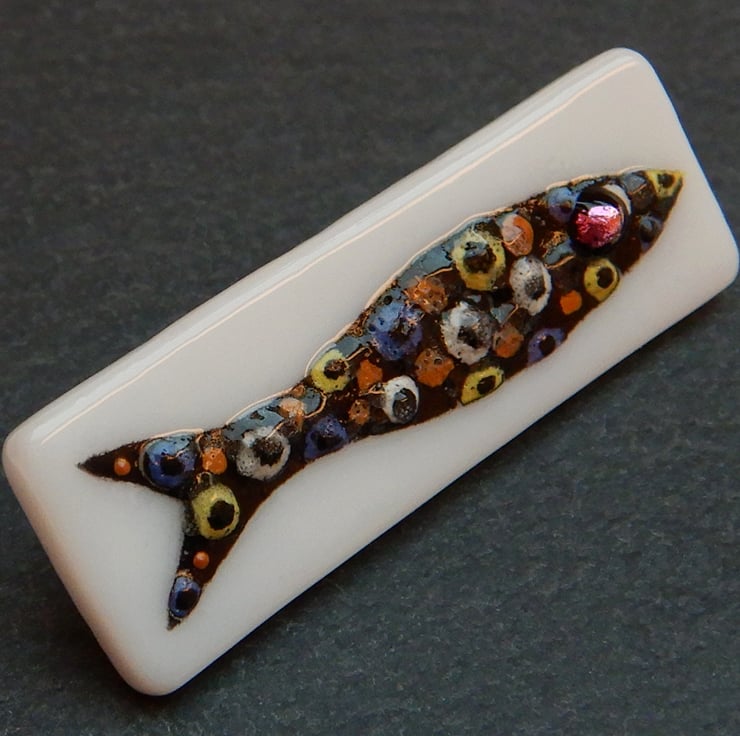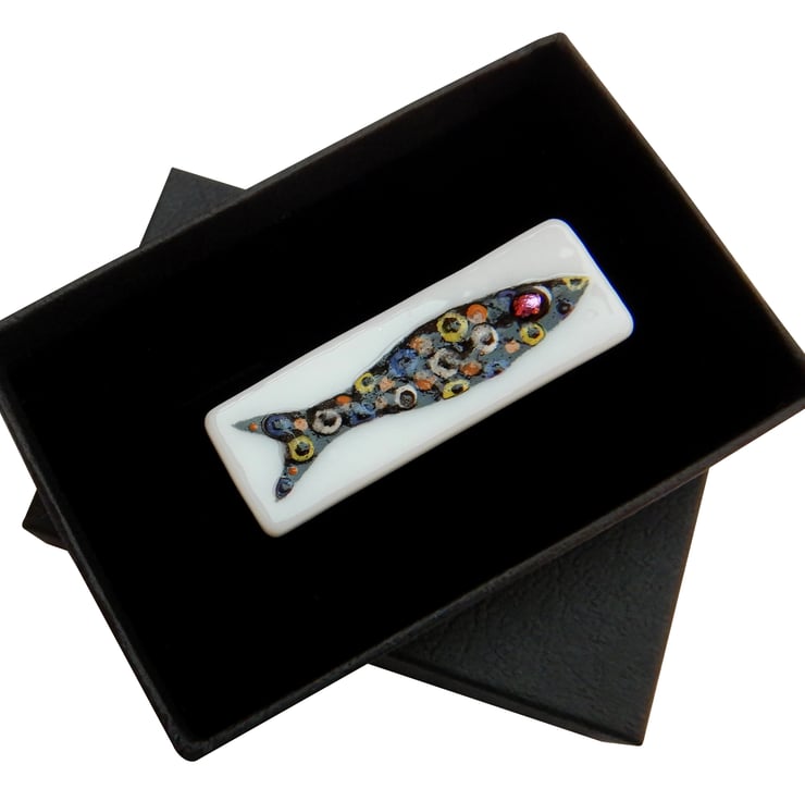 UNIQUE: Handmade Fused Glass 'SARDINE' Brooch. The little fish has been very carefully hand painted onto the surface of a white glass backing. No paint has been used but instead it is very finely ground fusing glass mixed with water. At this stage the blending of colours and adding of details was possible. The eye of the fish is made from metallic dichroic glass. Finally transparent glass was sprinkled onto the surface, to give the brooch an aquatic finish. The brooch was then fired in my kiln and the powdered glass and background fuse to become one piece.