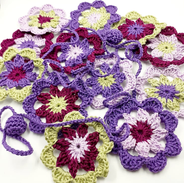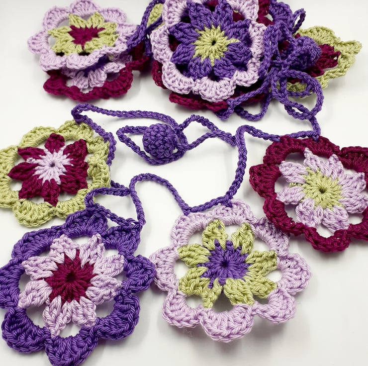 This elegant garland of 12 flowers is crocheted in violet, purple, lilac and pale green cotton from a pattern by Annie Designs Crochet. Each flower measures approximately 7.5 cm in diameter and the whole garland measures approximately 190 cm long. The ends of the string are finished with a crocheted 'bead'.