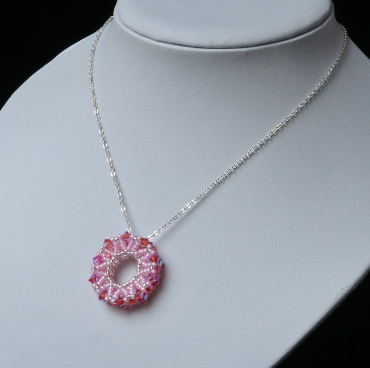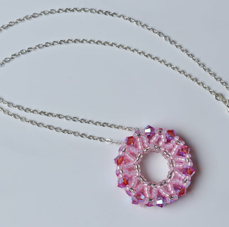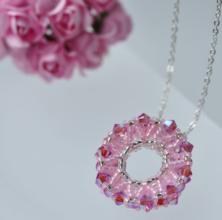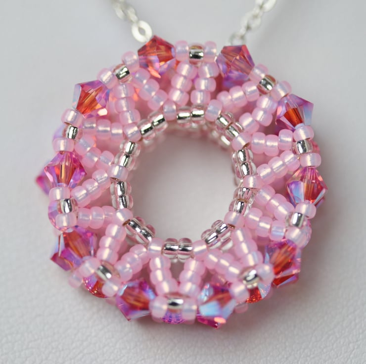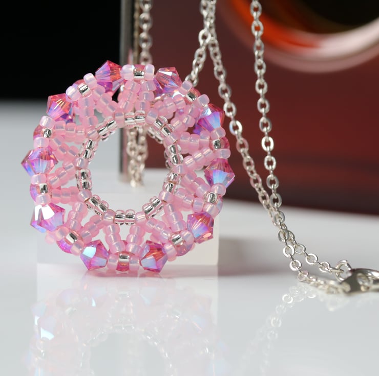 This pretty little pink pendant, made from rose coloured Swarovski crystals, is only just over an inch in diameter so ideal for anyone who does not like large pieces of jewellery. It is also double sided; with each side exactly the same so if, like me, you find your pendants spin round when you move about, you will never be showing off a less attractive reverse side. The crystals are stitched between tiny pearly pink seed beads and silver lined crystal beads and have an AB finish achieved from a thin metallic coating on some of the facets; these reflect the light and give a mirror-like effect.