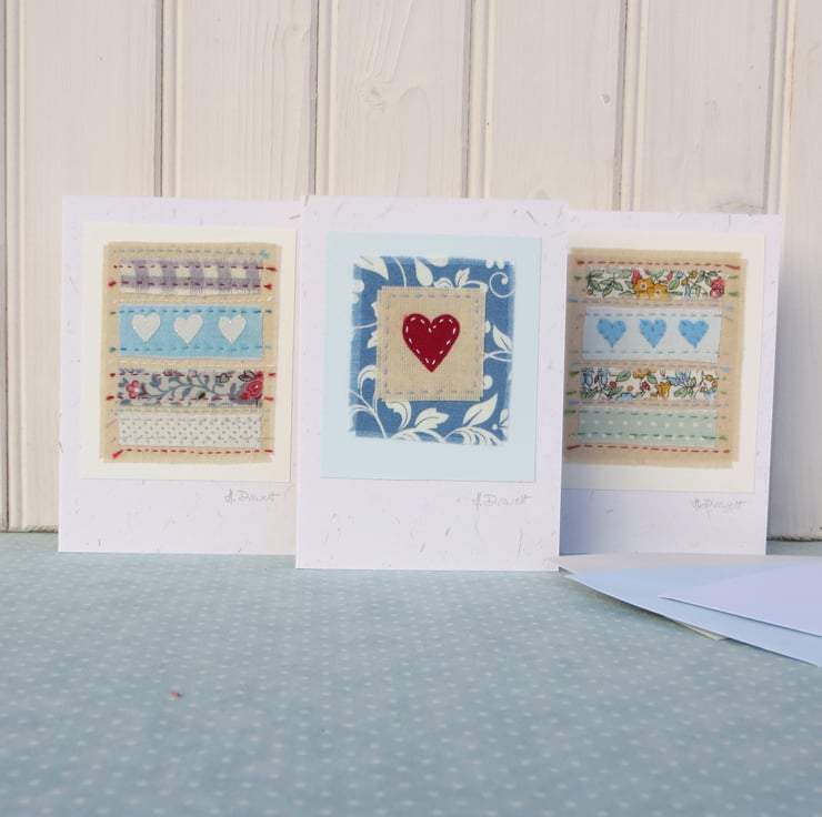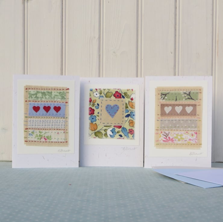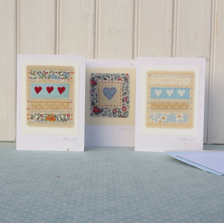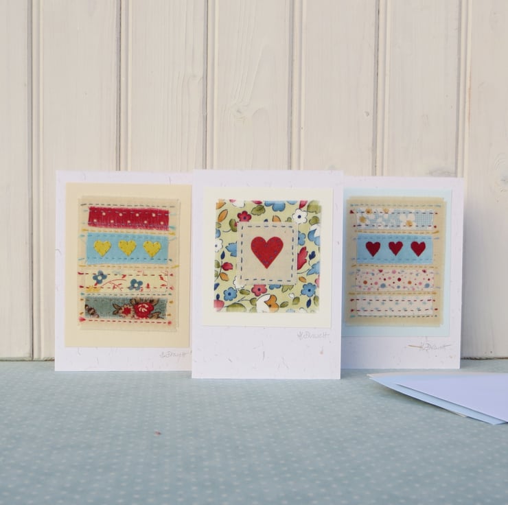 You will receive a pack of THREE cards: two of the three heart design, and one with the single heart, at a bargain price of only £2.60 per card! Each of the miniature hand-stitched textiles is mounted onto a card measuring approximately 3.5" x 5" (12 x 9 cm) when folded as shown, and comes with a matching recycled paper envelope, enclosed in a clear protective (compostable cornstarch) sleeve - no plastic!