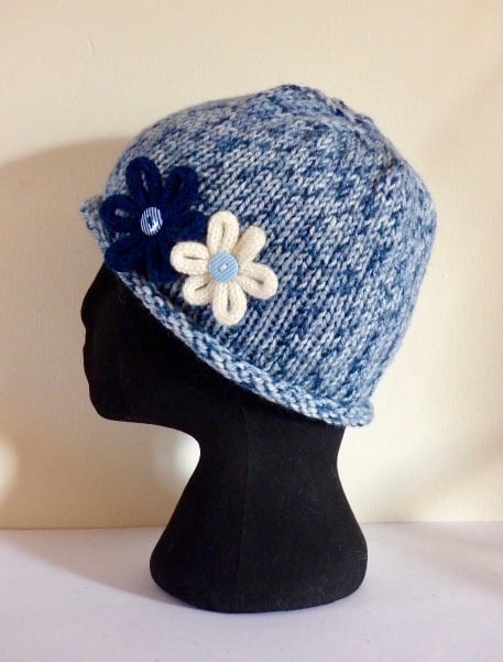 A hand knitted hat in a blue tweed yarn. The hat has an easy to wear roll rim and is decorated with two french knitted flowers in navy and cream with blue striped buttons. The hat measures approximately 18" around by 8" in depth so should fit a small adult head or an older child.