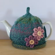 A hand knitted hat in a chunky 100% acrylic yarn which is self patterning. The colours range from a light sage green to a beige and cream. The hat measures approximately 19" around by 8" in depth (with plenty of stretch) so should fit most adult heads. Trimmed with a large Italian olive wood button this hat is ideal for a winter walk.