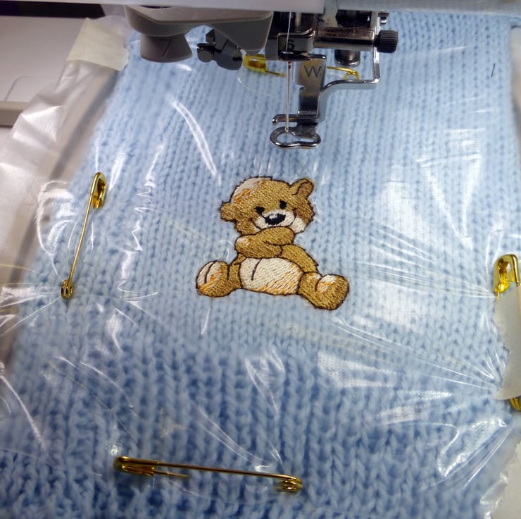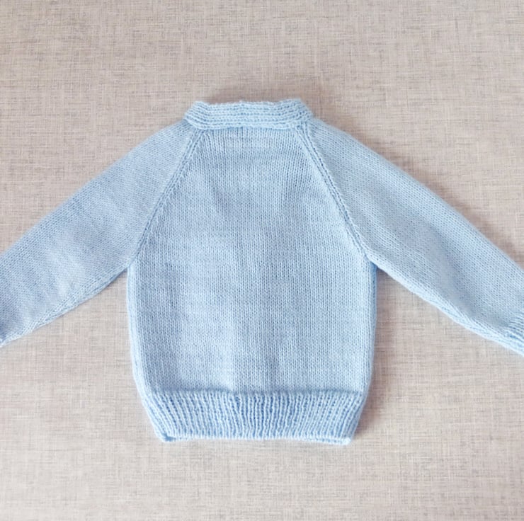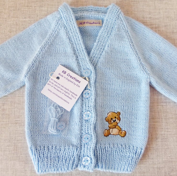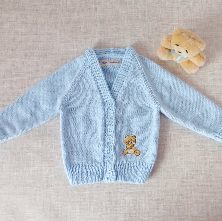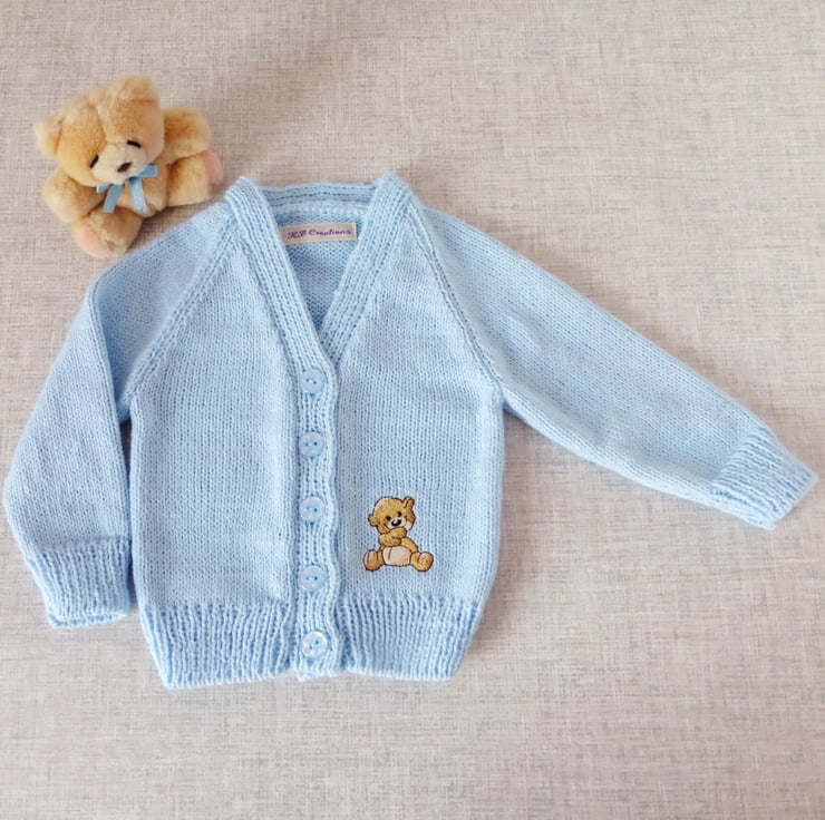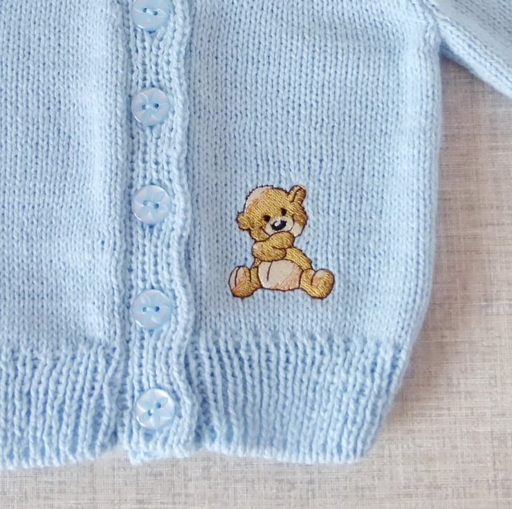 Lovely baby cardigan made in pale blue Yeoman 4 ply acrylic yarn, with an embroidered teddy bear motif on one side.