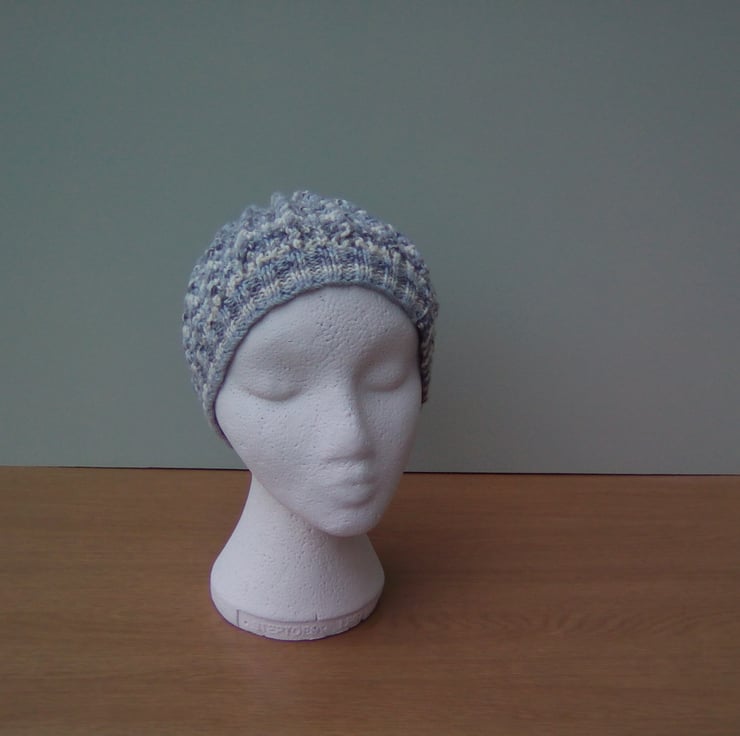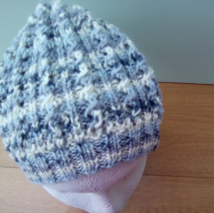 The yarn is a wool / acrylic blend with random colours of cream, light, medium and dark grey