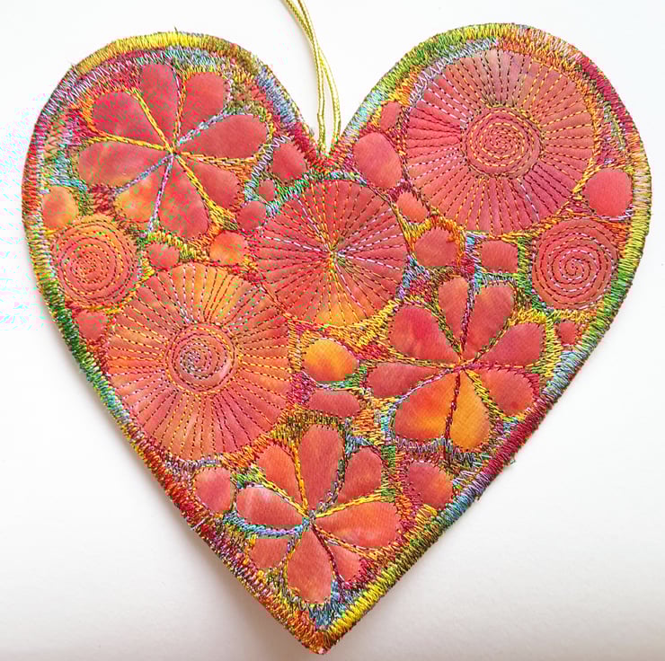 Made from layers of fabric including hand dyed Egyptian cotton and silk fabrics using the free machine embroidery style of sewing