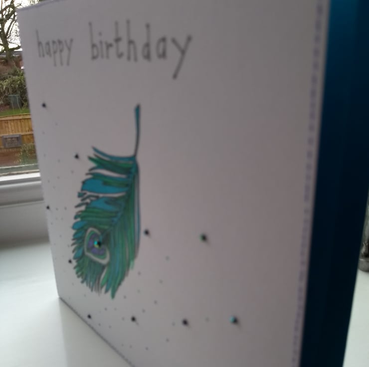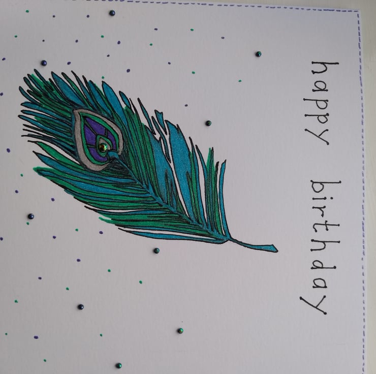 A completely handmade and uniquely designed card. Consisting of pristine white quality card which has been hand drawn with a peacock feather. Hand coloured in green, blue ,purple and silver. Happy birthday hand written in black ink. Finished off with blue/green rhinestone