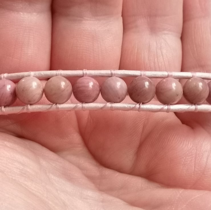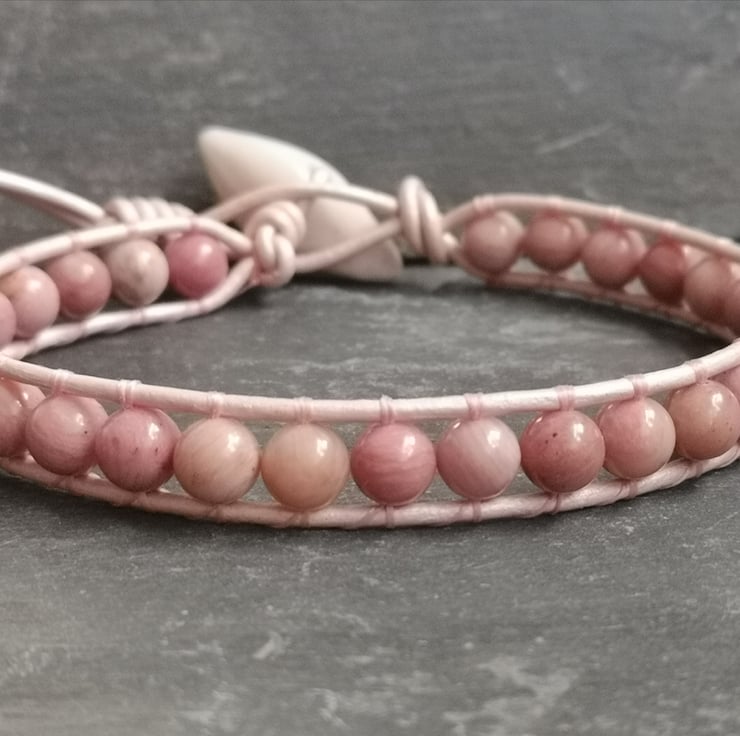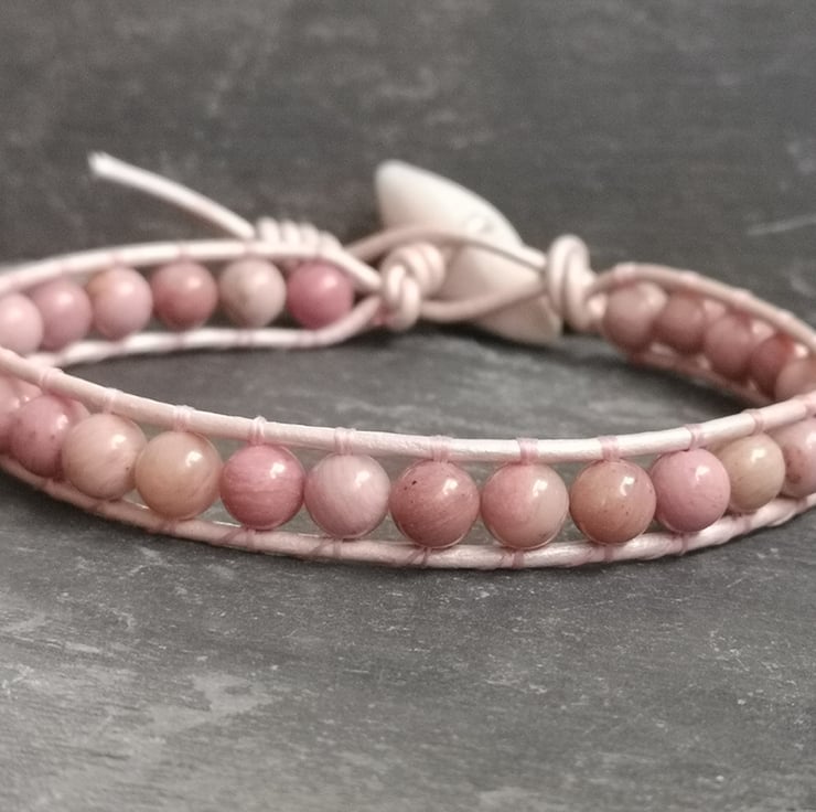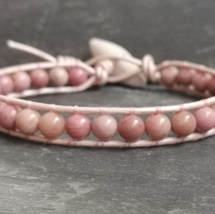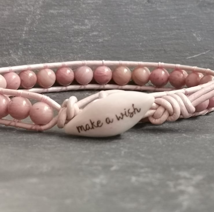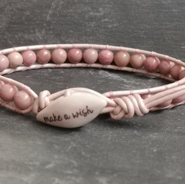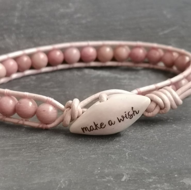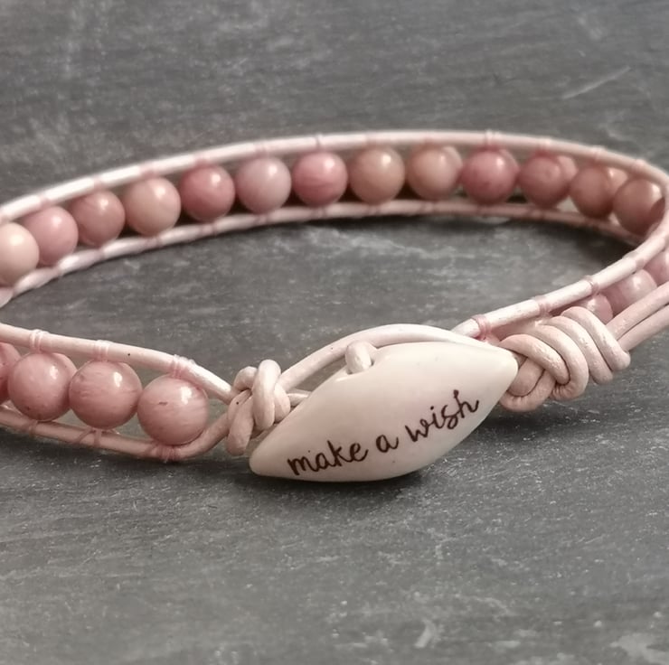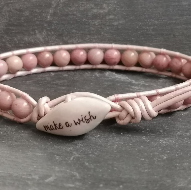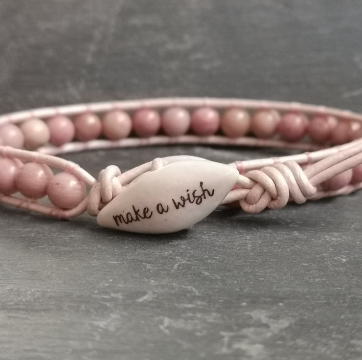 This delicately pretty bracelet has been made with soft leather cord in a pale metallic pink. Round Rhodonite gemstone beads in a mix of muted pinks and creams have been added. A ceramic lozenge shaped bead saying "make a wish" has been used as a fastener.