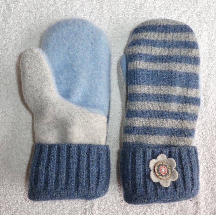 These warm and cosy winter mittens have been re-fashioned from up-cycled wool and angora sweaters. The jumpers have been washed and felted before stitching. A full lining for the mittens has been made from polyester polar fleece for warmth and comfort. A decorative felt flower with button center has been stitched to the cuff of the mittens.