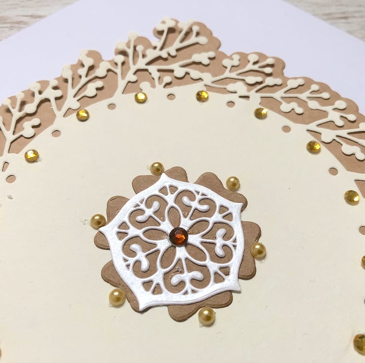 The card is embellished with faux golden topaz jewels, faux rubies and faux golden cream pearls. all designed to give it a luxurious feel.