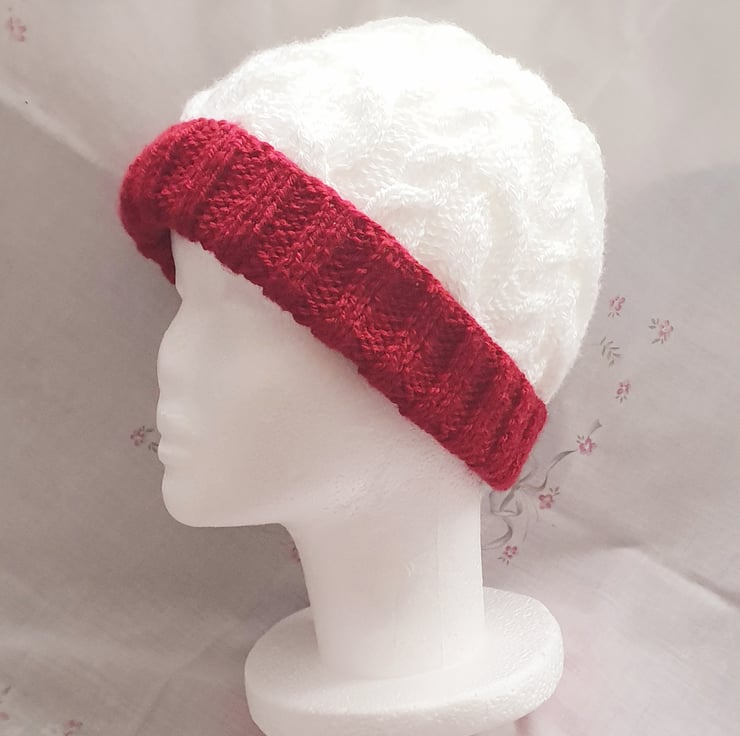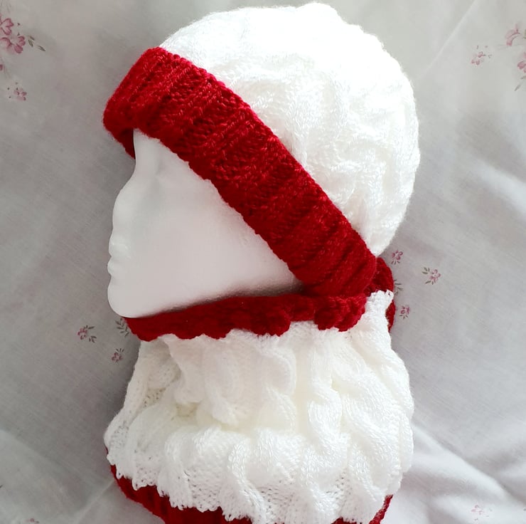White & Red hand-knitted Aran cable hat, cowl and a white pair of matching fingerless gloves.