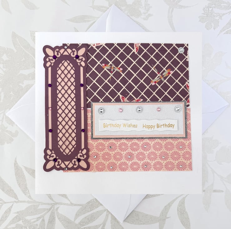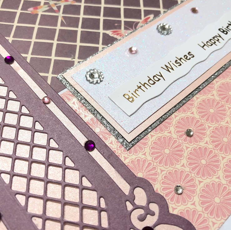 Birthday card - large size handmade birthday card cut from quality pink and purple plain, pearlised and patterned card stock. Gorgeous card made from gorgeous materials.
