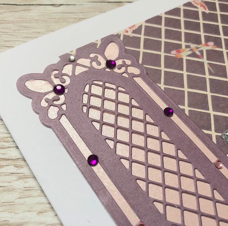 The birthday card is trimmed with faux pink sapphires, diamonds and cerise garnets, giving it a lovely sparkle which is complemented by the pearlised and glitter papers.