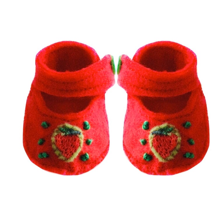 A cute little pair of red felt shoes, to fit the Mulberry Green characters. The shoes are decorated with little embroidered strawberries and French knots and fasten with a popper underneath a little green button.