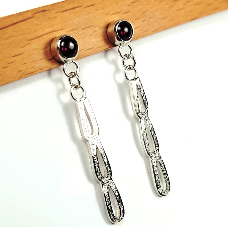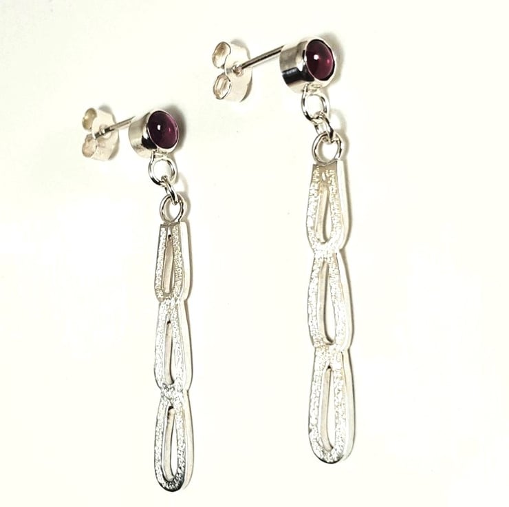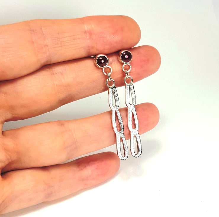 Each earring consists of three horseshoe shaped links soldered together and dangling from a garnet stud set in a sterling silver bezel.