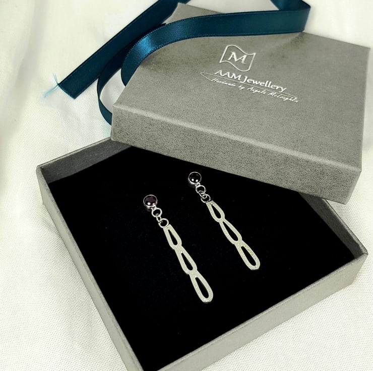 Sterling silver dangle/drop earrings with a gorgeous deep raspberry rhodolite garnet.